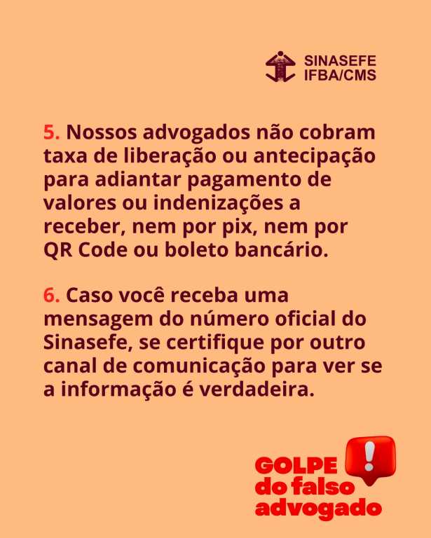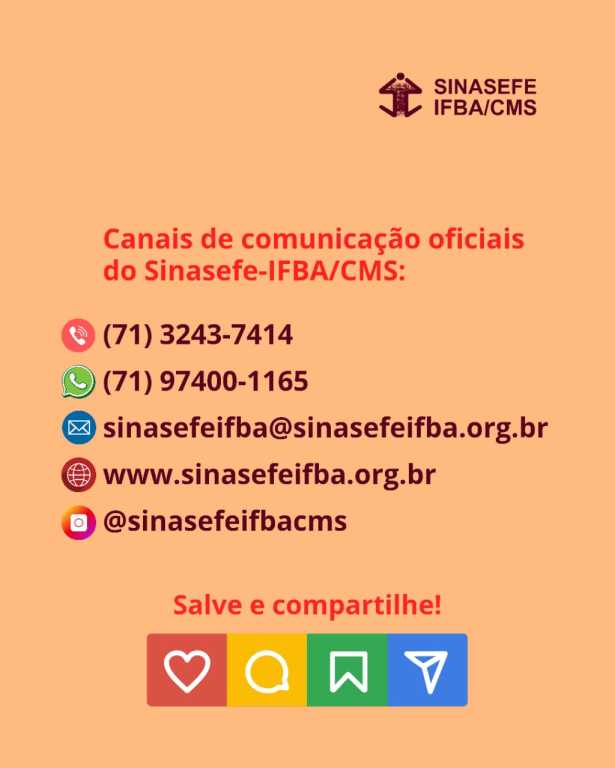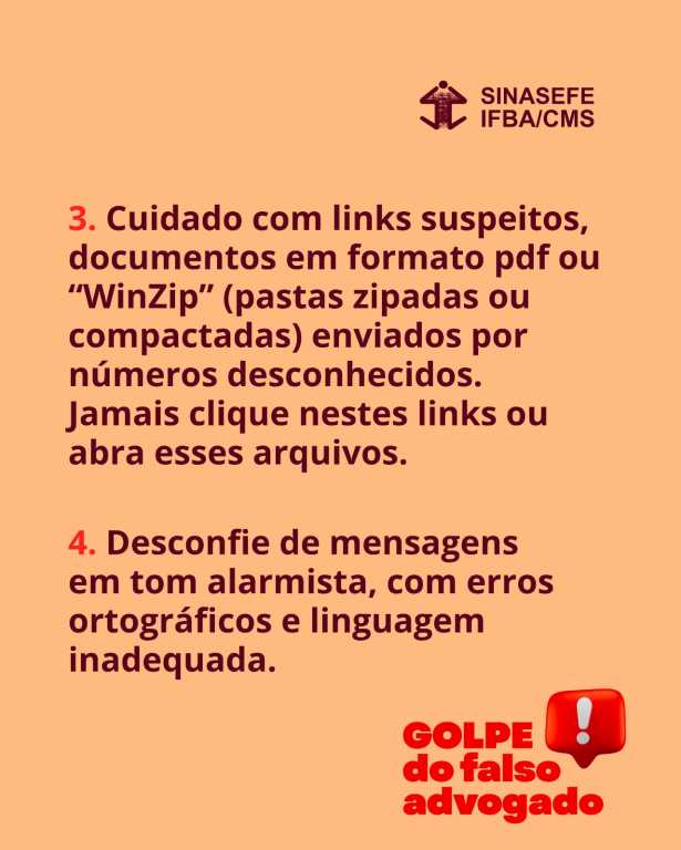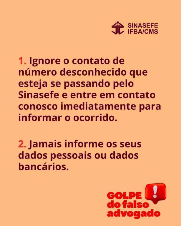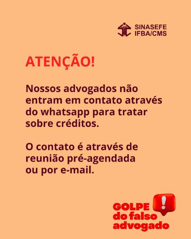 O SINASEFE-IFBA/CMS alerta suas(seus) filiadas(os) sobre tentativas de golpe praticadas por números desconhecidos que se passam pelo sindicato. Caso receba qualquer mensagem suspeita, ignore-a imediatamente e entre em contato conosco por meio dos nossos canais oficiais. Não compartilhe dados pessoais ou bancários e jamais abra links, PDFs ou arquivos compactados enviados por remetentes que você não conhece.